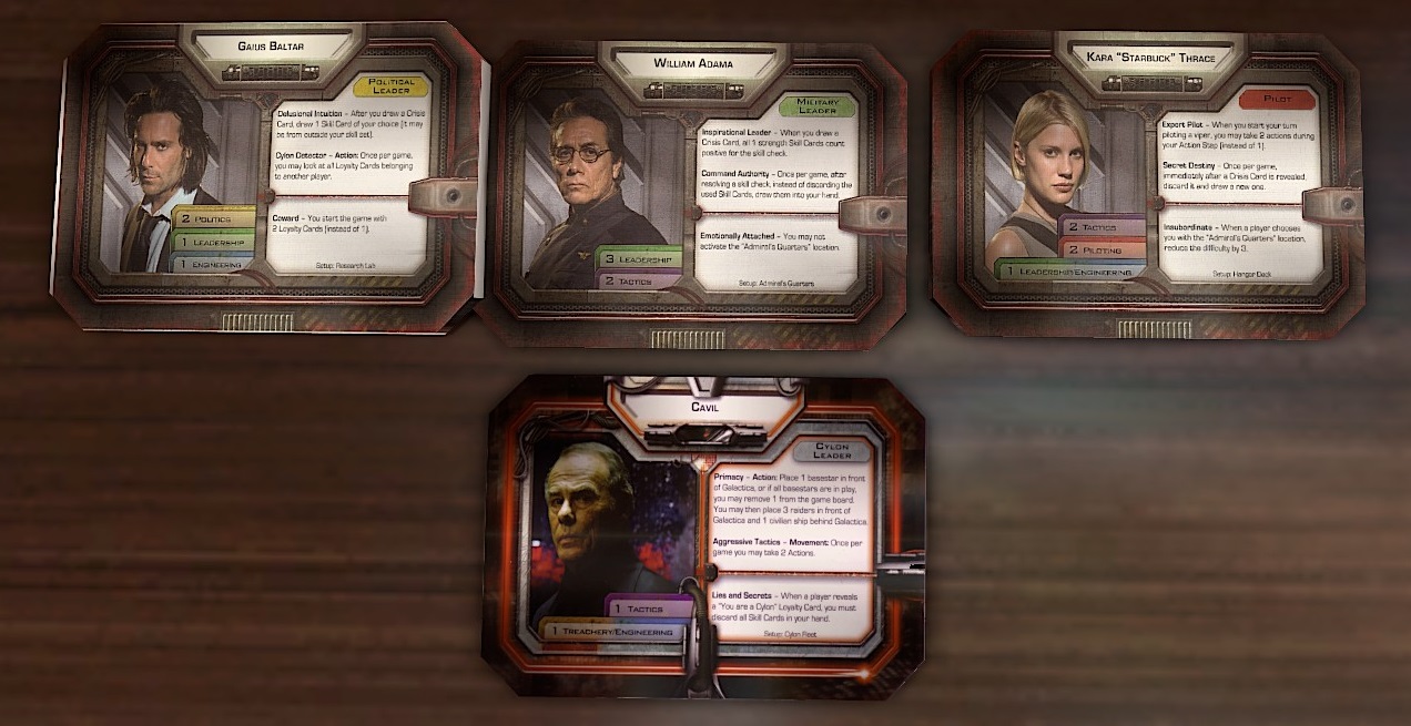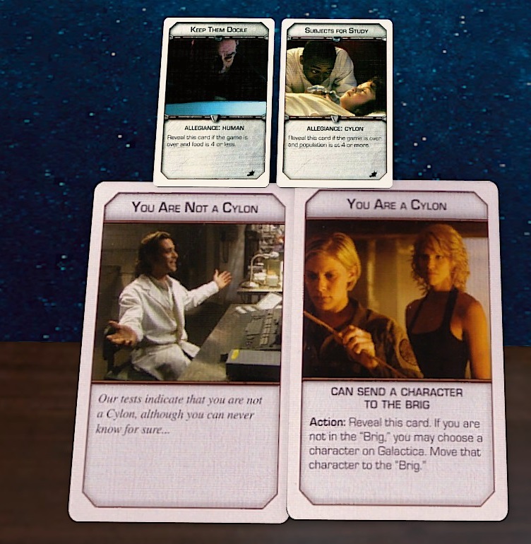 In addition to your hand of skill cards, players will have a Loyalty card. In a game of 4 players there'll be 8 loyalty cards in the deck, one of which is a cylon. Players draw one, and when they are through a Cylon Sympathizer card is shuffled into the deck. Halfway through the game players will draw a second loyalty card to represent sleeper agents activating. Notably, if the humans are doing very well, then the player who draws the Sympathizer card also becomes a Cylon, turning a game from what might have been a 4 vs 0 to a 2vs2 in a stroke. It's a really effective rubber-banding effect that deals with the problem that might have been caused from an unopposed early game for the humans.