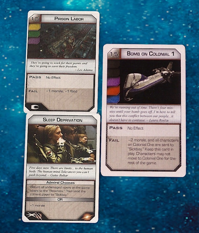 Then at the end of their turn they draw a Crisis, revealed to everyone - this is a group challenge. The crisis will have a number of colours on it, usually two - cards of this colour entered will add their value to the check, cards of different colours will subtract from the result. Two cards from the Destiny Deck (an assortment of random skill cards from every colour, designed to help create plausible deniability for Cylon sabotage) are added to a pile, and then each player in turn adds cards face-down into the pile. The deck is shuffled, the cards are revealed, and the number is totaled up. Does it beat the Crisis difficulty? If not, then some bad outcome will occur.