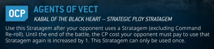 Agents of Vect is a powerful Stratagem, and for 0 CP it’s free real estate. Unless your opponent literally has no stratagems they’re likely to use twice - and we’ll see a few factions kind of fall into this category - you want to make sure you use it pretty much every game. Because it requires a Stratagem be used once and then be something an opponent wants to use again - whether or not they actually do isn’t the point - you’ll generally want to use it on either the first or second battle round to ensure that you’ve used it early enough to actually have that impact.When you do choose a Stratagem for Agents of Vect, your ideal targets - besides things that will be used again - are stratagems with a high upside that will force your opponent to play differently. You’re not necessarily going to stop an opponent from using them at all unless they’re strapped for CP, but you can force them to play more cautiously or adjust their strategies if they can non longer afford to blow 3-4 CP on a combo. In that sense, it can be very tough to get positive feedback for a successful Vect - it’s difficult to watch for what someone isn’t playing thanks to your use of the Stratagem. So you have to be mindful of what an opponent could do and what you’ve prevented them from doing by choking off some of their CP.