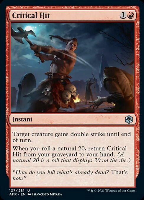 BPhilipYork: This is what I think of as a really good card design. It's a fun card, it's a great callback to a mechanic in another game. It's strong, but not broken, certainly not game-breaking but a very good value and slots really well into some kind of roll deck, and double strike is a strong but not overly strong ability, granting it is quite useful as an instant.