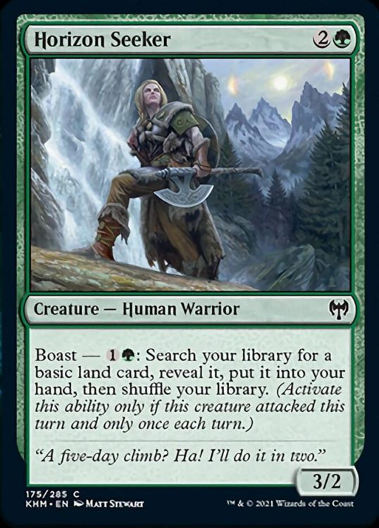 A flash 2/2 with First strike and pro-God, and exile target attacking or blocking creature until Sigrid leaves the battlefield. This card is so good I'm confused as to why it's white and not blue. Oh and it's a Human Warrior, both tribes with huge upsides.