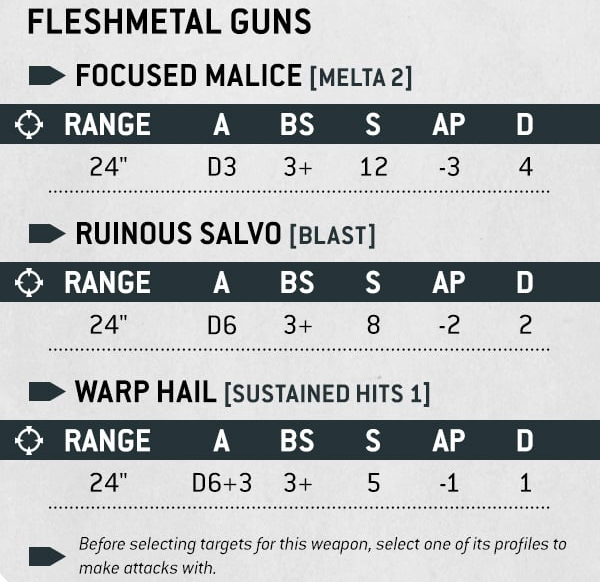 Credit: Warhammer CommunityThe Baleflamer is a little less interesting here for changes, since its profile is pretty similar to its current iteration. The Fleshmetal guns are interesting though. We still have random numbers of shots, which is a bummer, but each weapon picks up a special rule to make these guns worth thinking about. Especially now that I can add sustained hits 1 to a weapon almost anytime, the Str 12 damage 4 shots from focused malice may be an excellent anti-tank option. Especially since the squad can get some sustained hits action on their shooting.