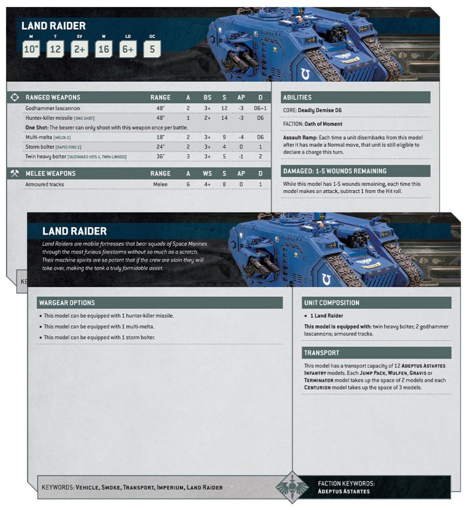 Next, we get to look at a very cool new datasheet, because it gives me a little bit of insight about what the Chaos version might look like: the Land Raider. Its degradation on losing wounds is far less brutal than before, it’s jumped up to toughness 12, and as mentioned briefly earlier in the article it gained the Assault Ramp rule that lets units get out, move and charge after the Land Raider has moved. That's a big threat extension for any unit that can fit in one, which is good news for Primaris marines as it looks like they will finally be allowed on the party bus.