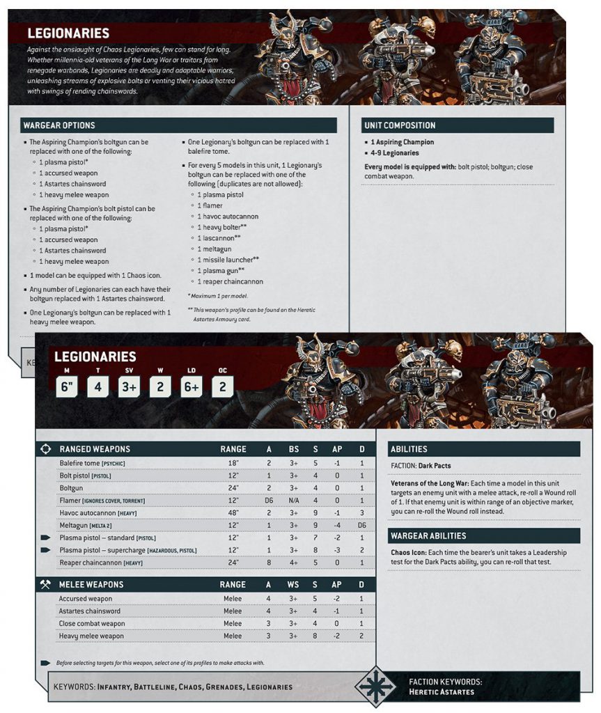 Credit: Warhammer CommunityWhat a thing of beauty. Legionaries look like they will have lots of very flexible Wargear options, and hit hard enough to trade really well into units on objectives with the new Veterans of the Long War ability. Especially when the squad has a Chaos Icon and can reroll failed leadership checks on Dark Pacts. A slam dunk datasheet, I love looking at it.