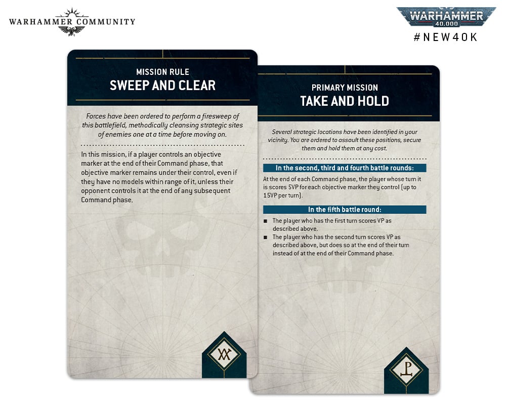 Credit: Warhammer CommunityScoring on primary looks to be capped out at 50 points, and scoring on the secondary missions is capped out at 40. After determining attacker and defender, but before deploying models, you declare your secondary missions. With the mission decks, you can either select Fixed Missions or Tactical Missions. Fixed Missions are similar to what we have now in the GT packs, where the player has seven different options to pick from and selects two secondary missions to remain in effect the whole game.