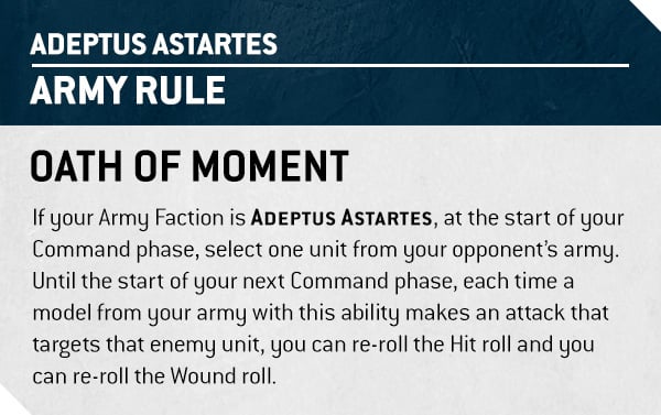 Firstly, Oaths of Moment is the Space Marine army rule and it’s as potent as it is simple.