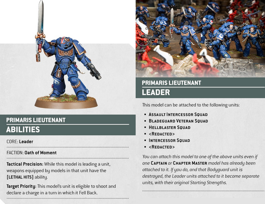 Credit: Warhammer CommunityWe see an example of this with the Space Marine Lieutenant in the Warcom article, who can join a squad and provide the unit with the ability to fall back and shoot as well as shoot and charge when the Lieutenant’s unit falls back as well as giving their weapons Lethal Hits. The Space Marine Lieutenant is also a rare breed of character who can join a squad that already has a character in it, which is interesting and implies that some other minor characters may also be able to do this. This also explains why you might need to put 12 power-armored guys into a Repulsor, since that unit might have a Captain and a Lieutenant joined to it.