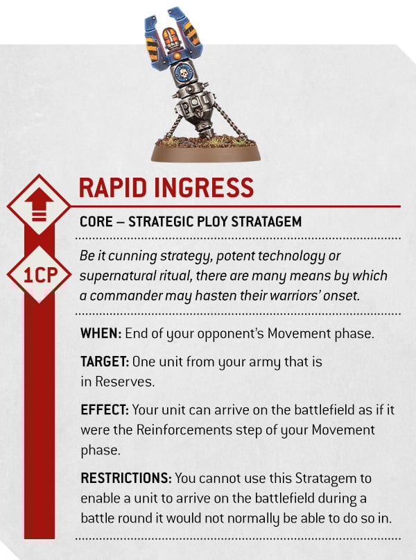 We’ve been informed that there are 12 Core Stratagems which every army has access to, and up to 6 Detachment Stratagems. It’s also implied that CP generation is going to be rather low, which means that Stratagems are likely to be 1 or 2 CP (notably the only 2 CP one we’ve seen so far has been a Space Marine stratagem for fighting on death).We’ve only seen one Core Stratagem so far, which is Rapid Ingress, which allows a unit to arrive onto the board at the end of the opponent’s movement phase, as opposed to your own. We also expect the Command Re-roll to be back, but beyond that is anyone's guess.