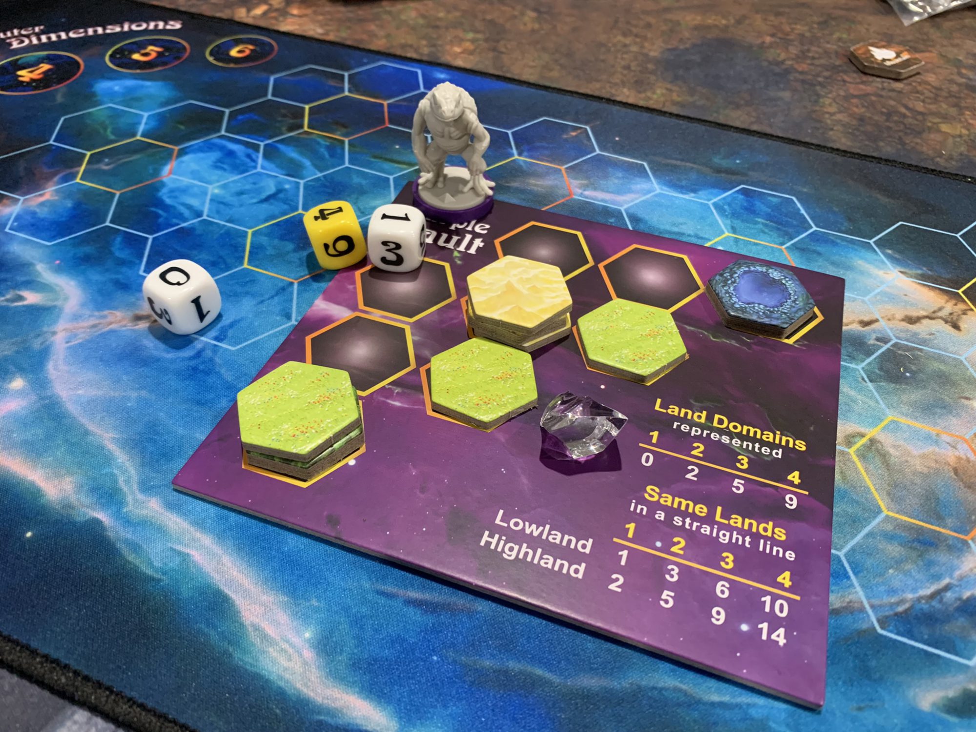 If you can fill your Gullet and jump back into the Aether surrounding the Shard you'll have the chance to regurgitate terrain into your Vault. Only lands in your Vault will score points at the end of the game but there's a catch. The geometric configuration of your stacked land matters greatly. The Great Gods want a variety of land types, but also want connected strings of similar land. Stacks can be created to generate mid-game resources, but can get in the way of scoring lines. Complicating matters is the fact that land enters your vault in the opposite order it was consumed (Last In, First Out).
