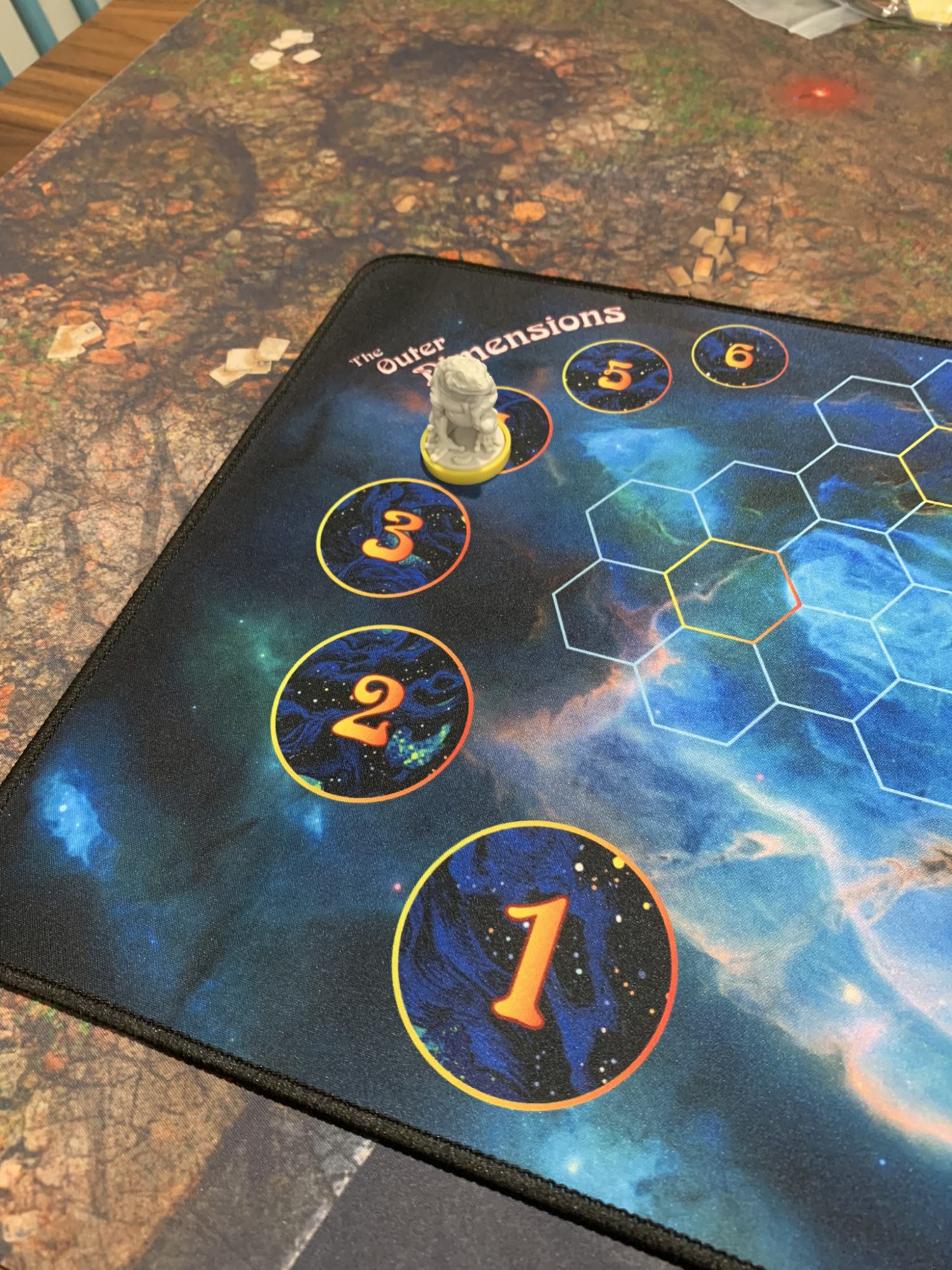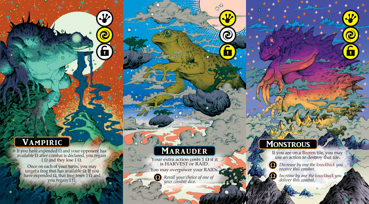 Players whose frog is punted into the Outer Dimensions get to watch passively as their vault is raided by others desperate for one more lake or that last bit of swamp that survived the meteors crashing into the shard. This can be tough to swallow, as "skip a turn" mechanisms have mostly been left behind decades ago. That little bit of Felli magic makes it work however; as your turns are skipped you store energy until you finally reemerge. The longer you're stuck outside the playscape the more powerful your explosive return becomes.