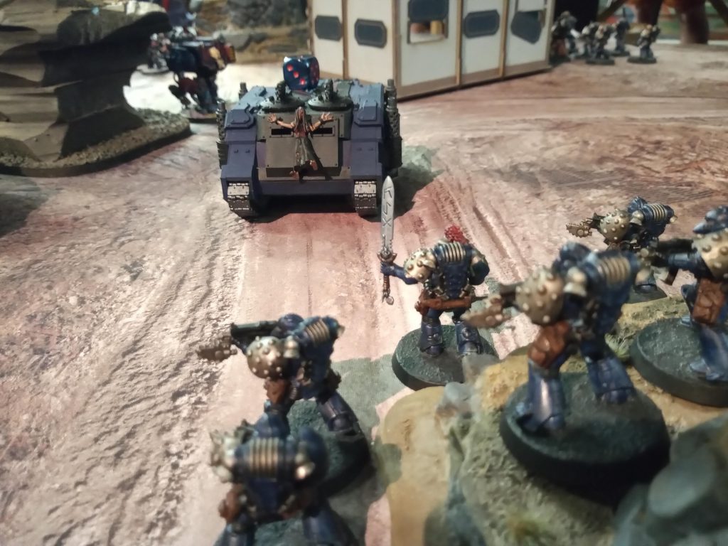 "The She-Wolf" Tiber Larentian rallies their squad as an enemy Rhino prepares to ram them.While my command squad tore through his backline, there was chaos in the middle of the board, as rhinos from both sides just started ramming infantry, and with the leadership penalty from night fighting an awful lot of them ran away. Alastair’s inductii jumped out of their storm eagle (which apparently had its best performance of the event this game), and were able to charge one of my tactical squads who were already running away after being rammed by a damaged rhino. Another failed leadership test meant they were removed from the board. In revenge, one of my own rhinos then charged his inductii, and another two failed leadership tests saw them run away and then get removed from the board by a charge from my praetorian breachers. Another set of rams into my breachers had no impact, but after they charged and destroyed one of the rhinos, the other rammed them again and this time they ran. They recovered just in time to be rammed again in the final turn of the game and run away one last time.