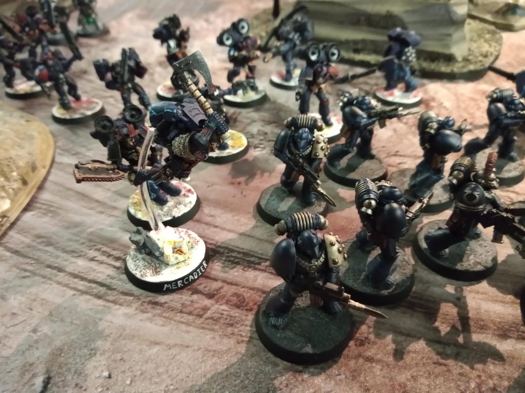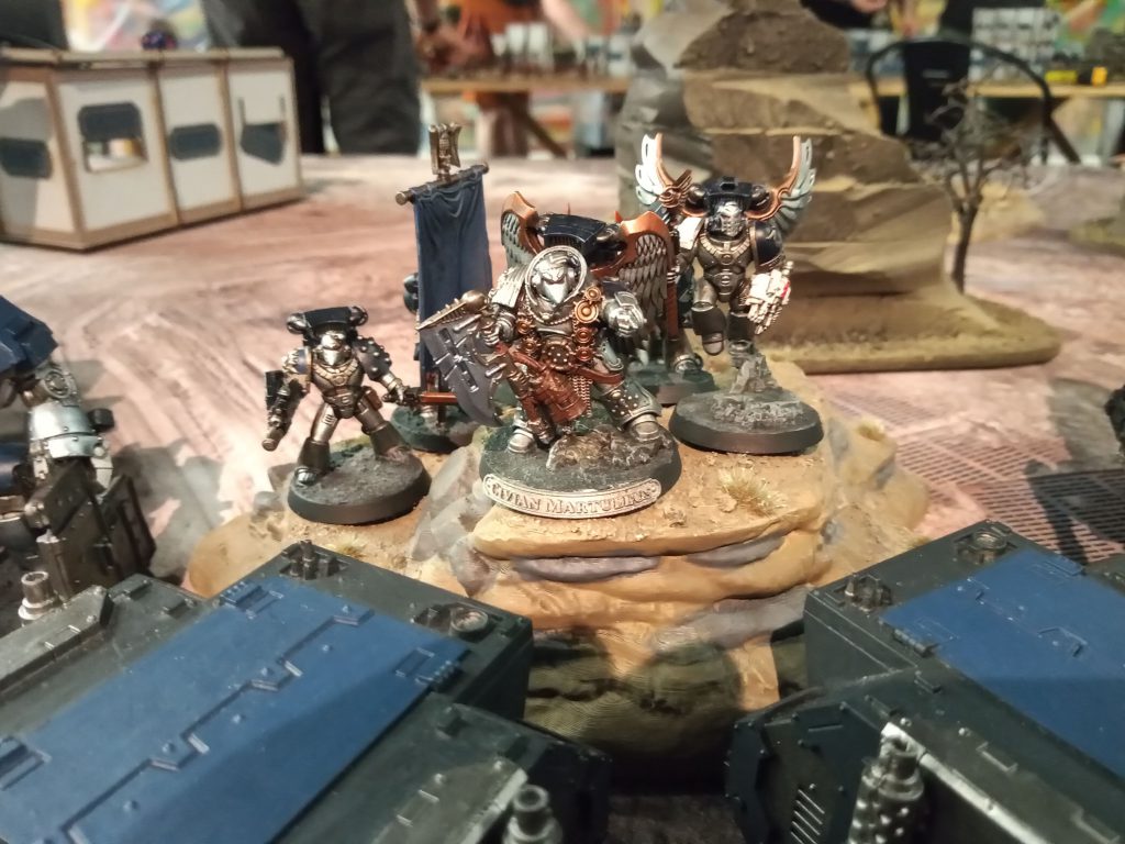 Survivors of the Ultramarines 203rd CompanyI brought the same force I’d brought to every event so far, the Ultramarines 203rd Company, also known as the Disciples of the Silver Eagle, under the command of Civian Martullus. The company are a ragtag band of survivors who are on the verge of being Blackshields (though they use the Ultramarines rules most of the time). Despite losing their Emperor-blessed ship at Calth, they view themselves as the Emperor’s favoured sons and will do anything to prove themselves as such. Their colour scheme is based on that of the Silver Eagles successor chapter, who they eventually become after the war. I’ve written up a truly ridiculous amount of backstory for them, including naming every character and sergeant, of which I’ve included a small excerpt after the army lists below.