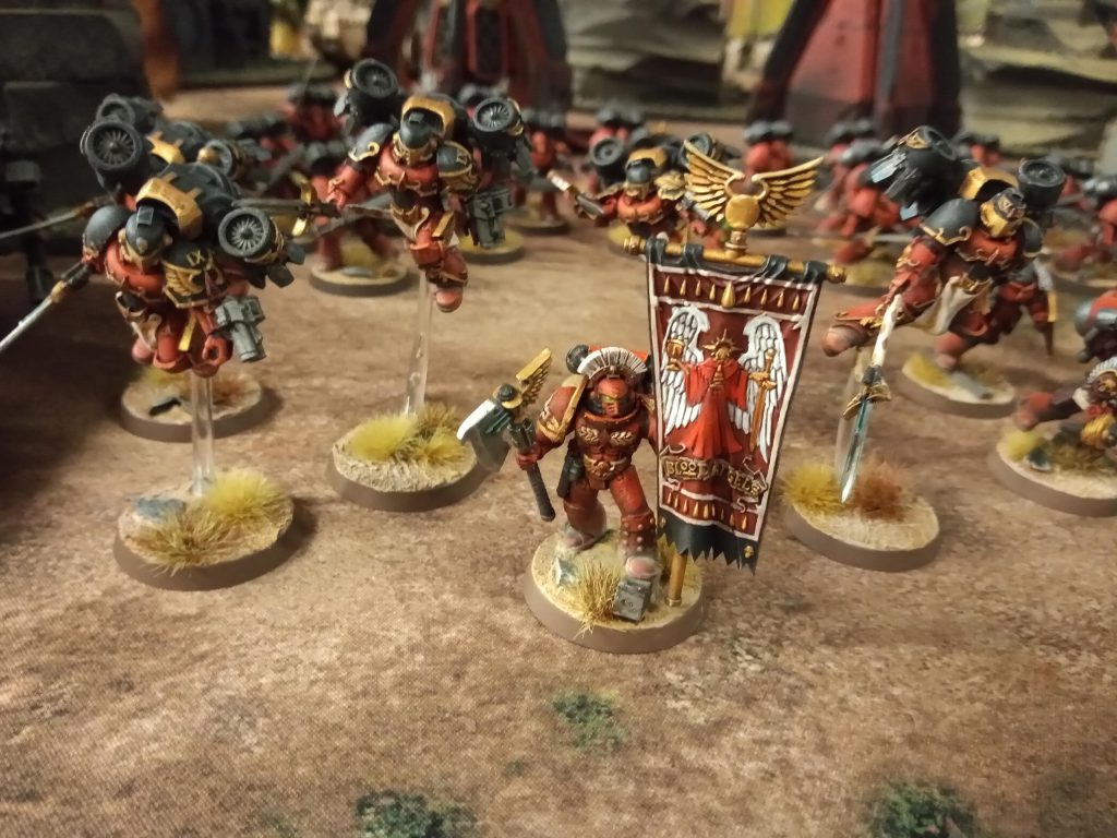 Rob's Dawnbreaker CohortFirst up is Rob, our Blood Angels player. At the last event he’d been running Death Guard, but this time he had a very cool drop assault based Blood Angels force. Tactically, the list relied on using two deathstorm drop pods to essentially get to place down terrain anywhere you want on turn one, often effectively dividing the board in two, plus the Day of Revelations rite of war to guarantee that your reserves arrived when and where you wanted. This made for a very effective army that he really enjoyed playing. His army were the Host of the Iron Angel, led by Dantare Ameel (the Iron Angel himself) but commanded by his ally Mephisto Jorem.