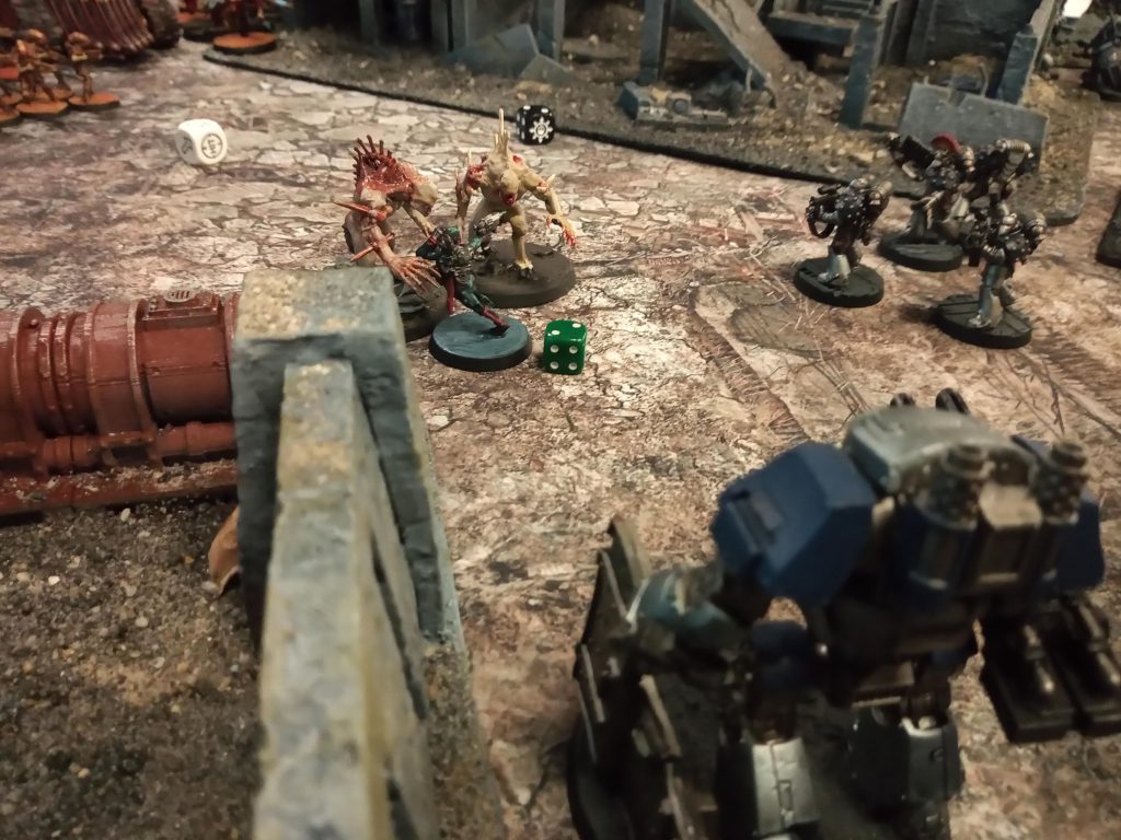 I was on the back foot almost immediately, as Charlie’s army countered pretty much every advantage I had. His two units of thallax could outmanoeuvre me with their ability to move after shooting, and they denied infiltration and scouting in a 24” bubble which took away any advantage in movement I would normally have. He outnumbered me thanks to his Solar Auxilia allies, and the addition of the supporting daemon brutes offset his lack of melee.
