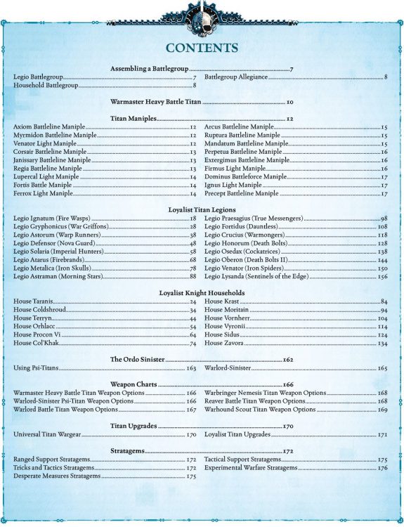 We’re going to be upfront here: nearly all of what’s in this book is reprints of stuff that’s been previously released elsewhere. From the rules on assembling a battlegroup, to the various maniples, to (nearly) all of the Titan legions and Knight households, to the various stratagems on offer, most of this is stuff that you’ve seen before in previous releases, collated and organized into a single reference.