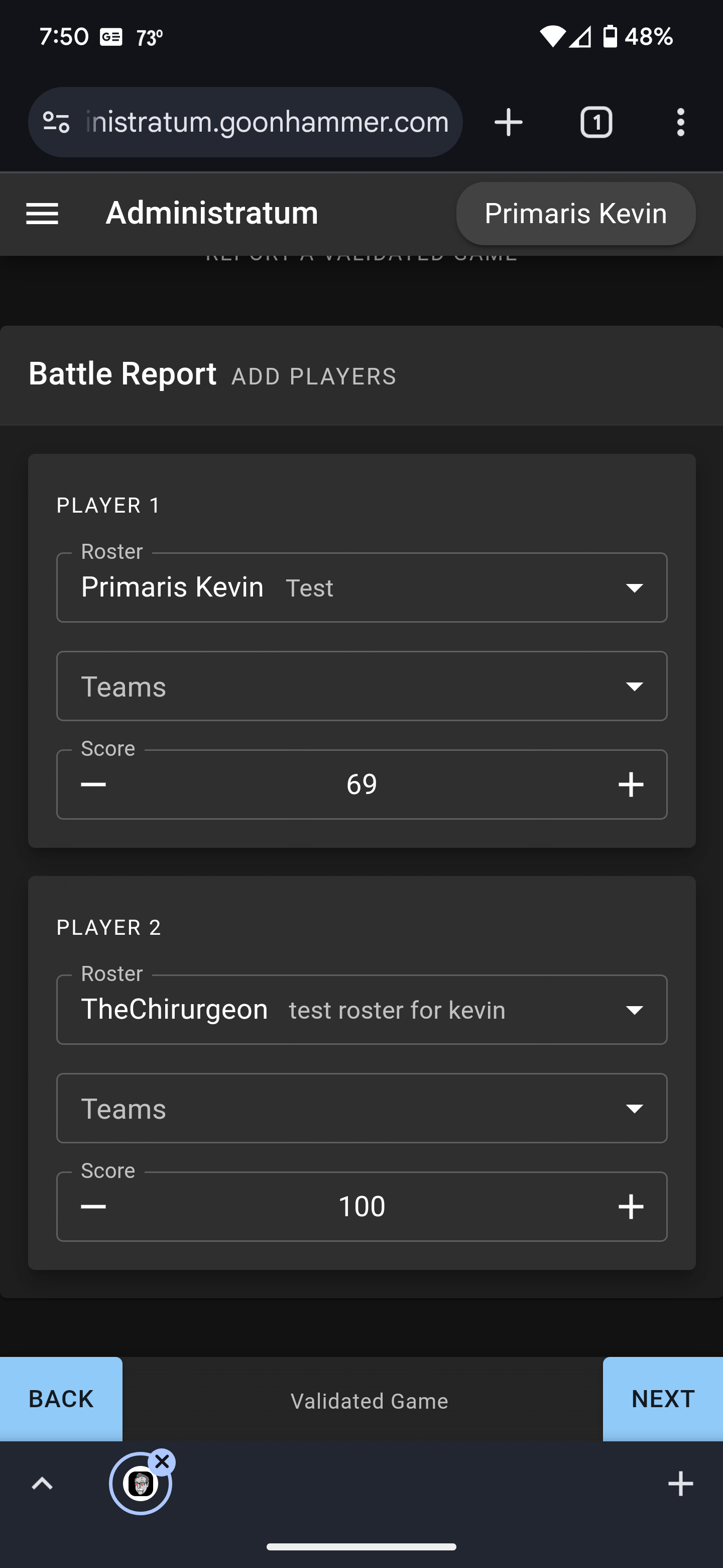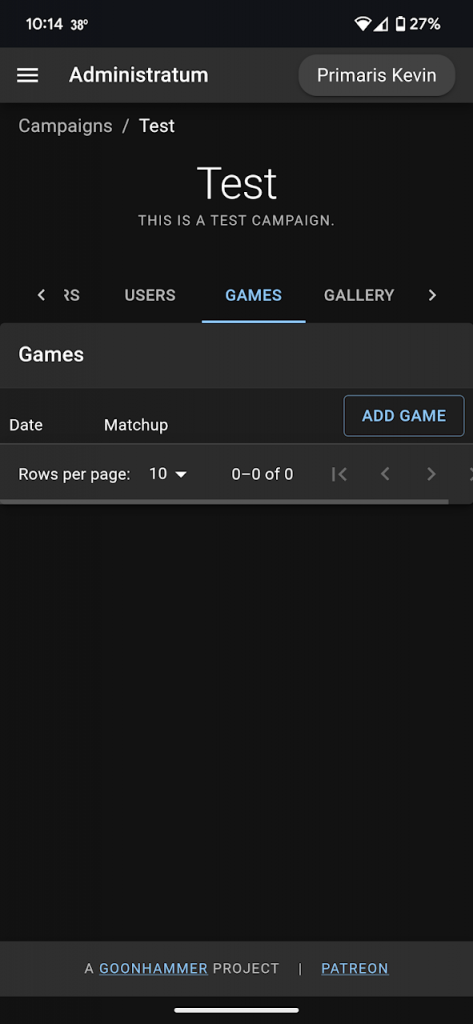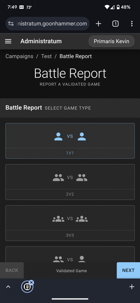 Once you have created a roster and joined a campaign, the final element is inputting the games themselves. Administratum has two options for entering games; Validated Games and Solo Games. The difference is that a Validated Game is linked to a specific opponent who then verifies the game. Solo Games are simply entered on your own.