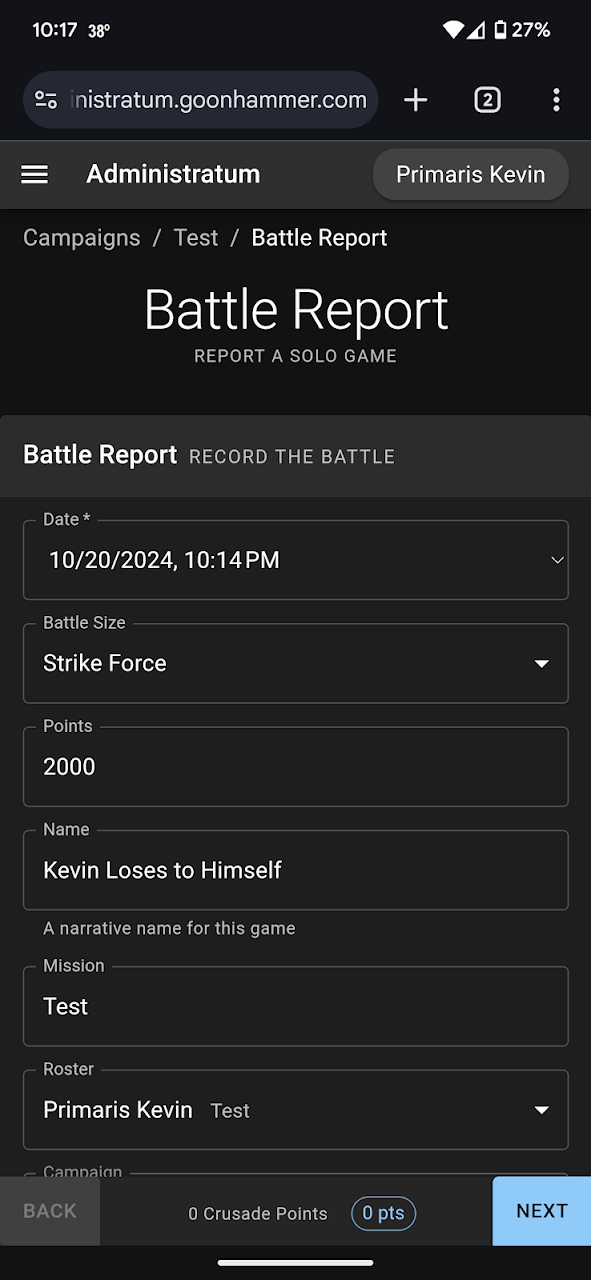 Upon selecting the Solo Game option you will be entered into a Battle Report. The date will automatically be entered, and the Battle Size and Points default to Strike Force and 2000 point respectively. You then enter a name for the game, the mission, your opponent, their faction, your score, their score, and any victor bonus. Once you're done, click Next.