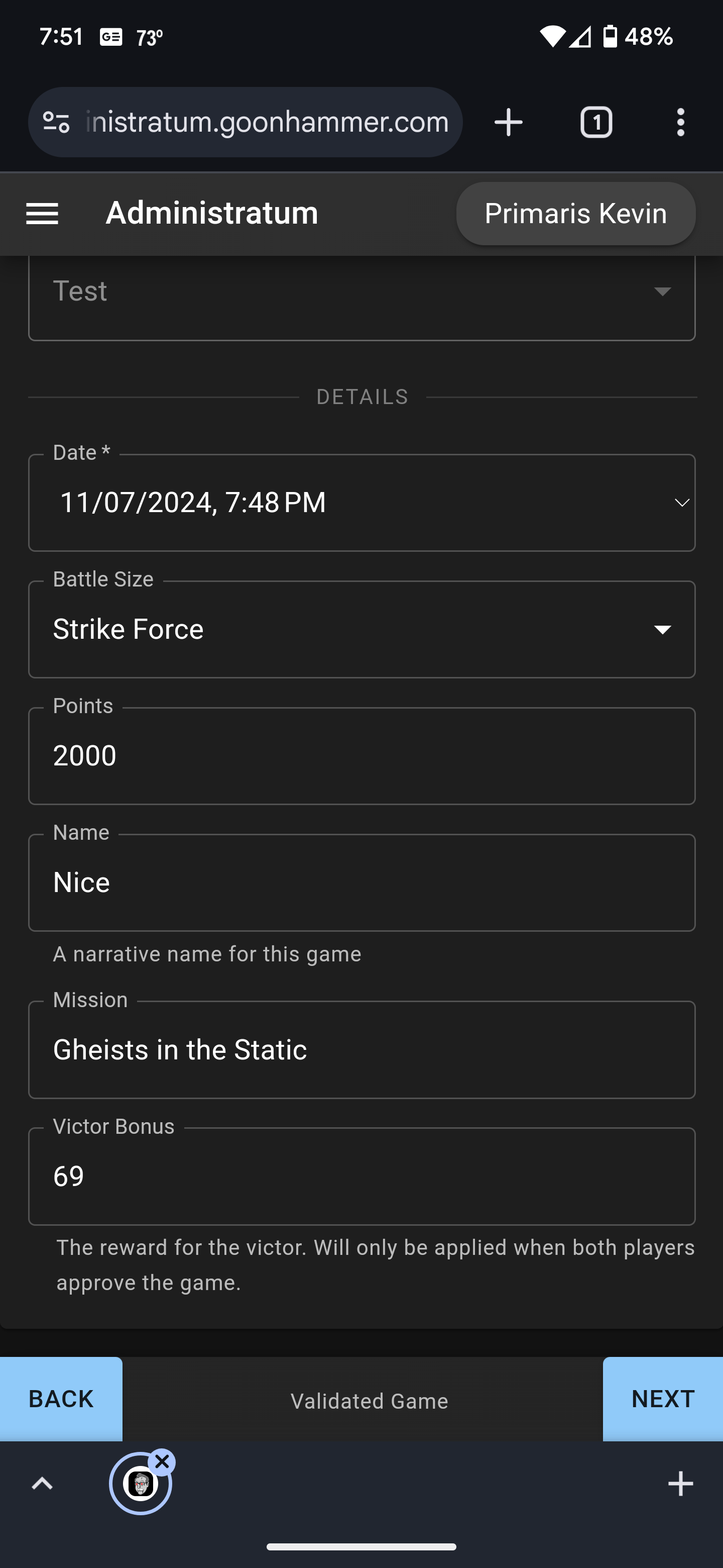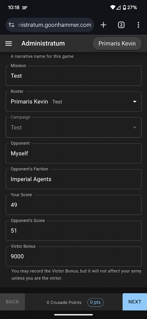 On the next page you can fill out the details including the date, battle size, number of points, a narrative name for the game, the mission, and the victor bonus. Fill these values out and click Next.