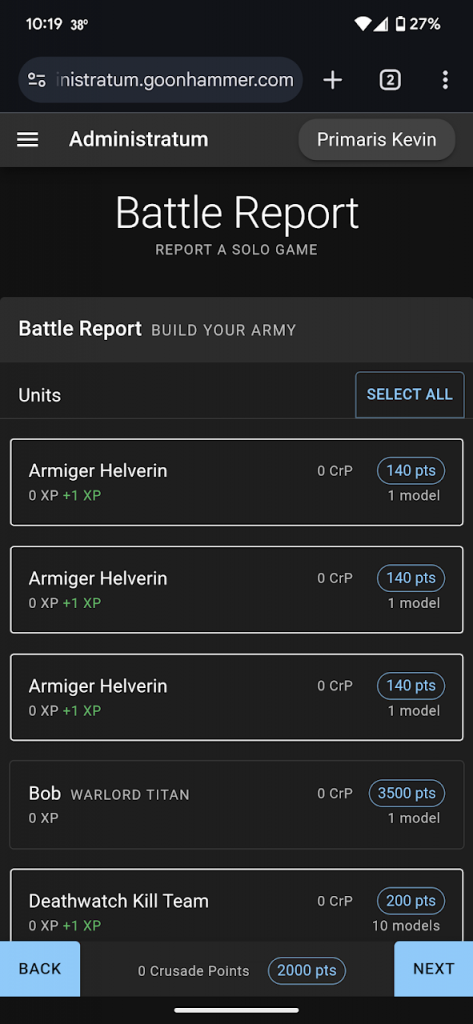 To confirm the game, first click on it from either the QR code, clicking View Game under the QR code if you entered the game, or by selecting the game from the campaign list. This will take you to the game page, where you have the option to approve the game or submit an army. To submit an army, click on the Submit Army text below your name. From here the process is identical to entering data for a solo game. You first click on the units that participated and then click Next. From there you note the results for each unit; their kills, agenda and bonus XP, if they were Marked for Greatness, and if they were destroyed. After filling this out for each unit you click Next to review the entries before clicking Submit to record the army.That's it! Once you get the hang of things you'll find that the app is pretty easy to work with. Having used the app at the 2023 Grand Narrative, I can personally attest to how effective it was at helping me keep track of my campaign.