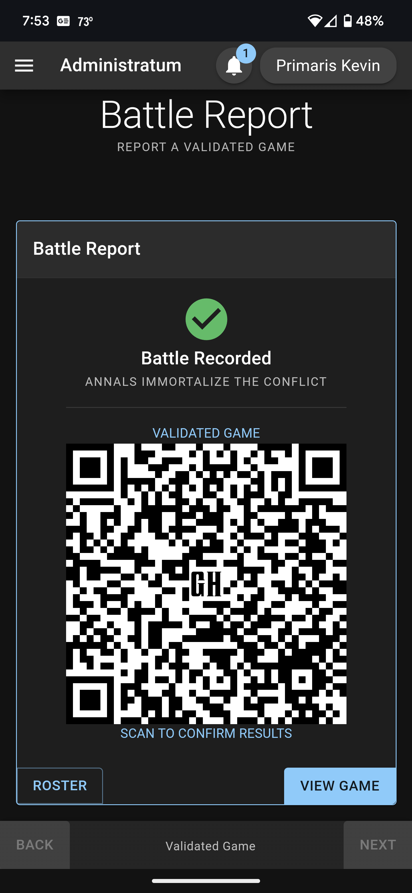 The final page is an option to review the entries before clicking the Submit button. If something needs to change, click Back and fix it. Once you're ready, click Submit. The next page will show a QR code you can reveal to your opponent(s) to have them confirm the results. The game is added to the campaign list with a pending approval note.