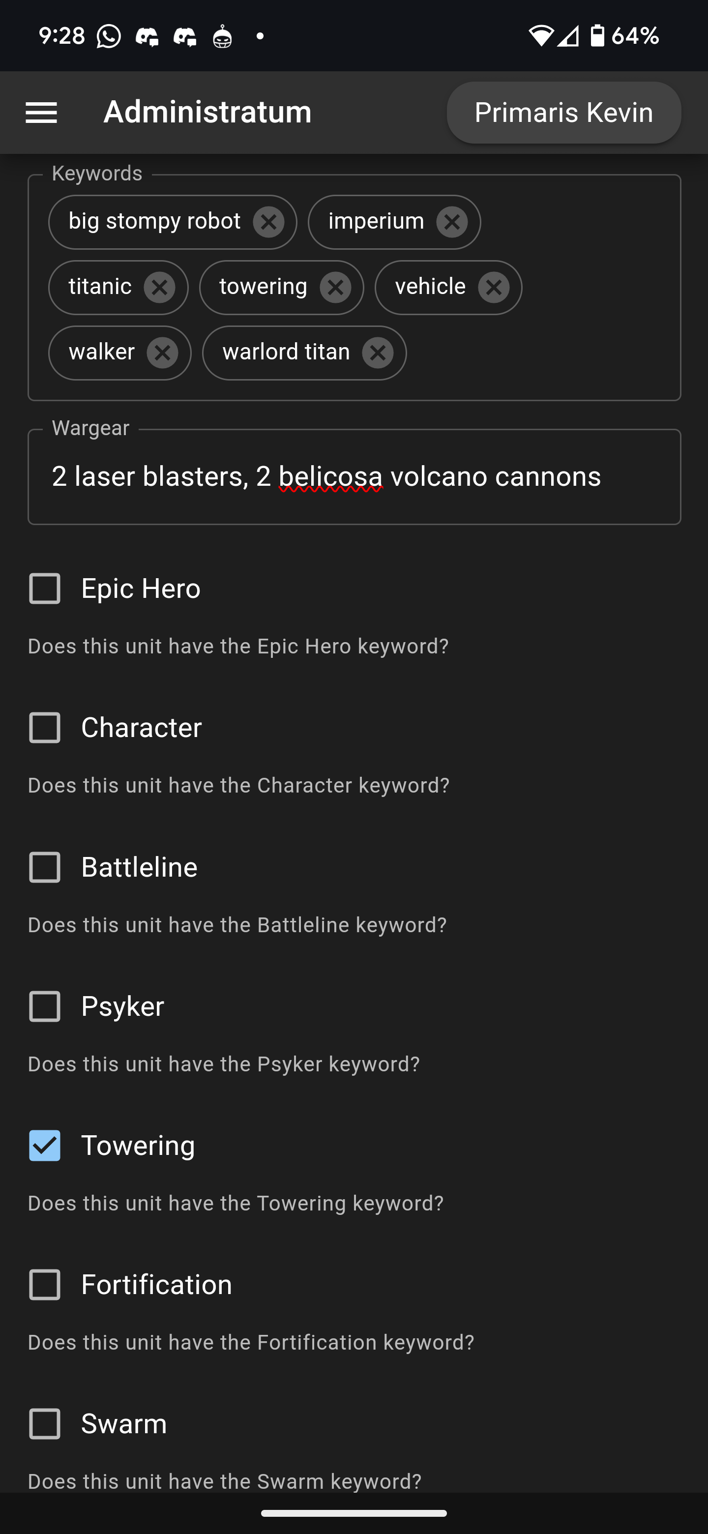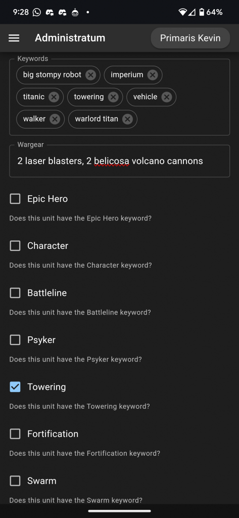 Once a unit has been created, you can access and edit it by going to the Units tab and then clicking or pressing on the row associated with the unit you want to edit. To edit the Wargear, click on the Wargear row. Edit the contents and then click Submit.