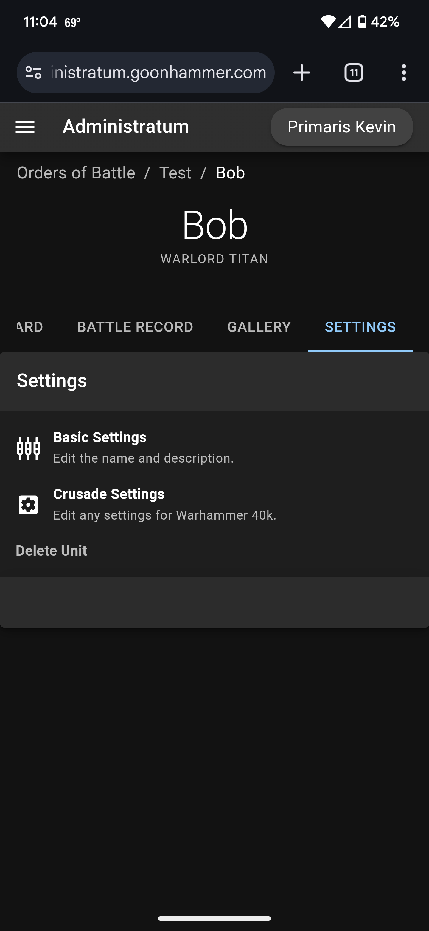 The other entries are editing by clicking on the Settings tab. There you have the option to edit Basic Settings to change the name and description, the Crusade Settings to edit everything else, or to delete the unit. The entries in the Crusade Settings option are similar to what you would see when you created a unit from scratch, along with an Advanced section for adjusting variables that are used by Administratum to automate and track unit progress. You shouldn't need to edit these.