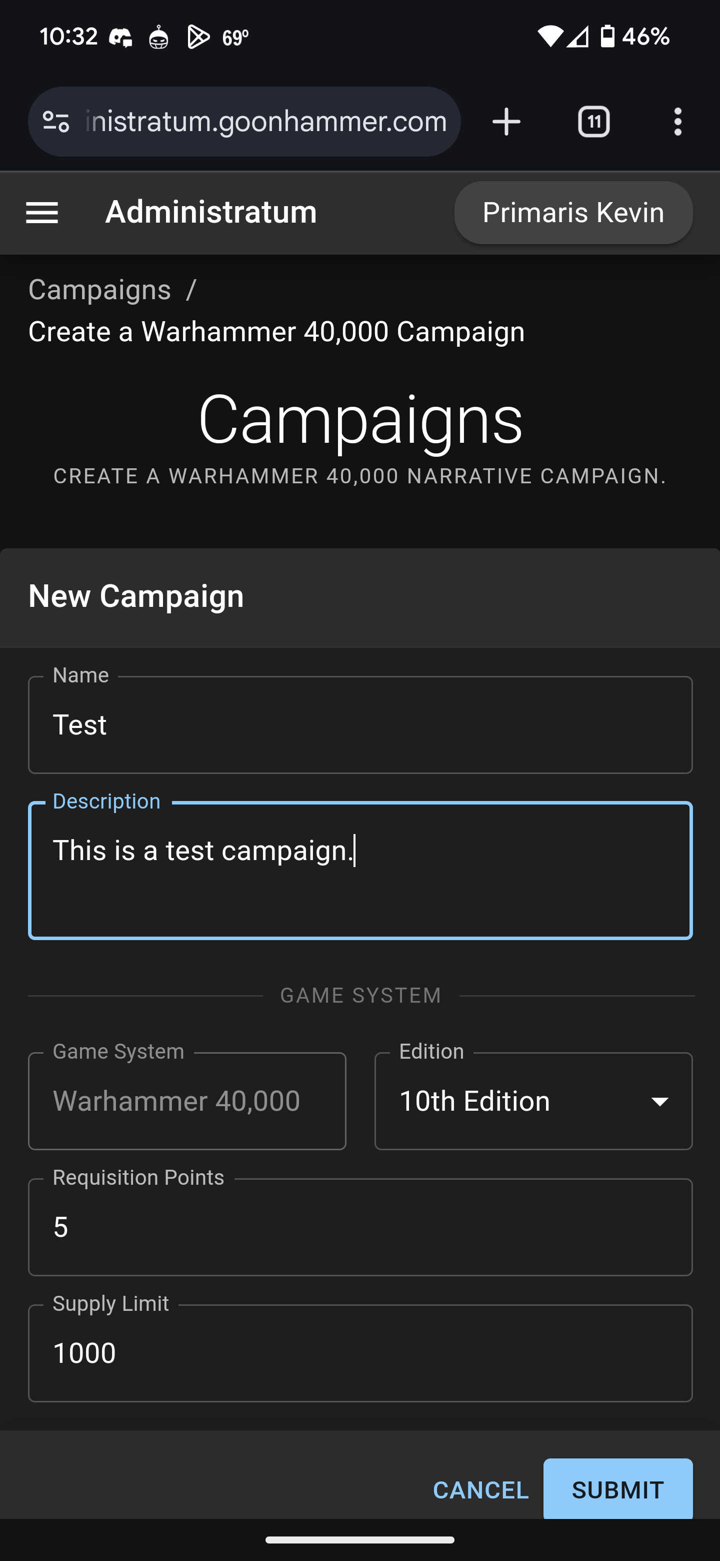 You can then enter the name of a campaign and the description. The remaining entries default to the Warhammer 40,000 10th Edition defaults, starting your players 5 Requisition Points and a Supply Limit of 1000. You can edit everything but the Game System before clicking the Submit button.