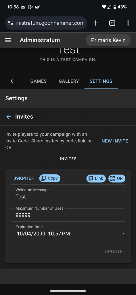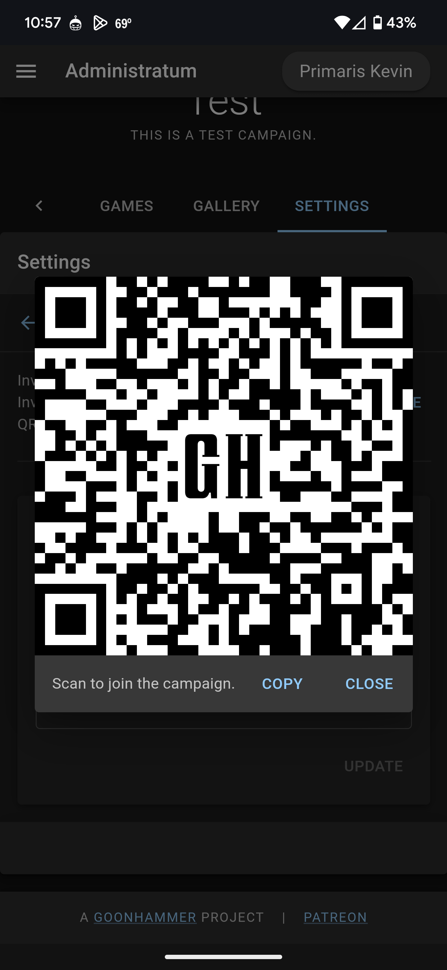 To invite others to join your campaign, you first go to the Settings tab of the campaign (it's located on the far right). Click on Invites to be taken to the relevant page. Note that while your maximum number of players is capped based on your Patreon level, Goonhammer Patrons at the $5 tier or higher don't count toward those caps.
