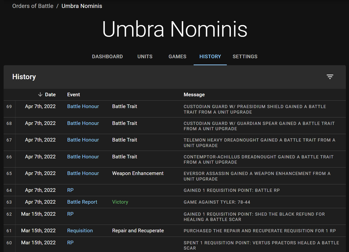 - Roster History - Unit - Creation date, removal date, Battle Honours gained, Battle Scars suffered, Battle Scars removed, Requisitions purchased, Warlord Traits gained, Relics gained, Specialist Reinforcements purchased, and more