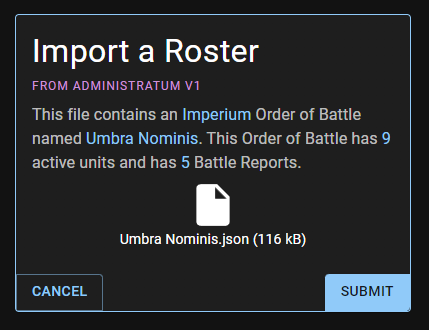 Don't actually click this screenshot. Or do. I'm not your dad.Importing your army couldn't be easier. Simply download your Order of Battle as JSON from Administratum v1's Download Your Forces page. Then head back to the new Administratum, go to the Rosters page, and click the "Import from v1" button. Select your file and Administratum will give you a one sentence preview. If things look good, click Submit and you're all done!