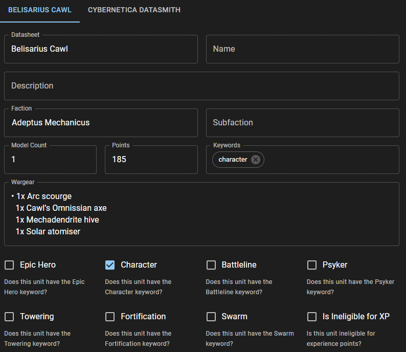 The importer now brings in more data than ever before. Model count, wargear, faction, subfaction, keywords, wargear: we live off the land and don't let any part of the data go to waste!