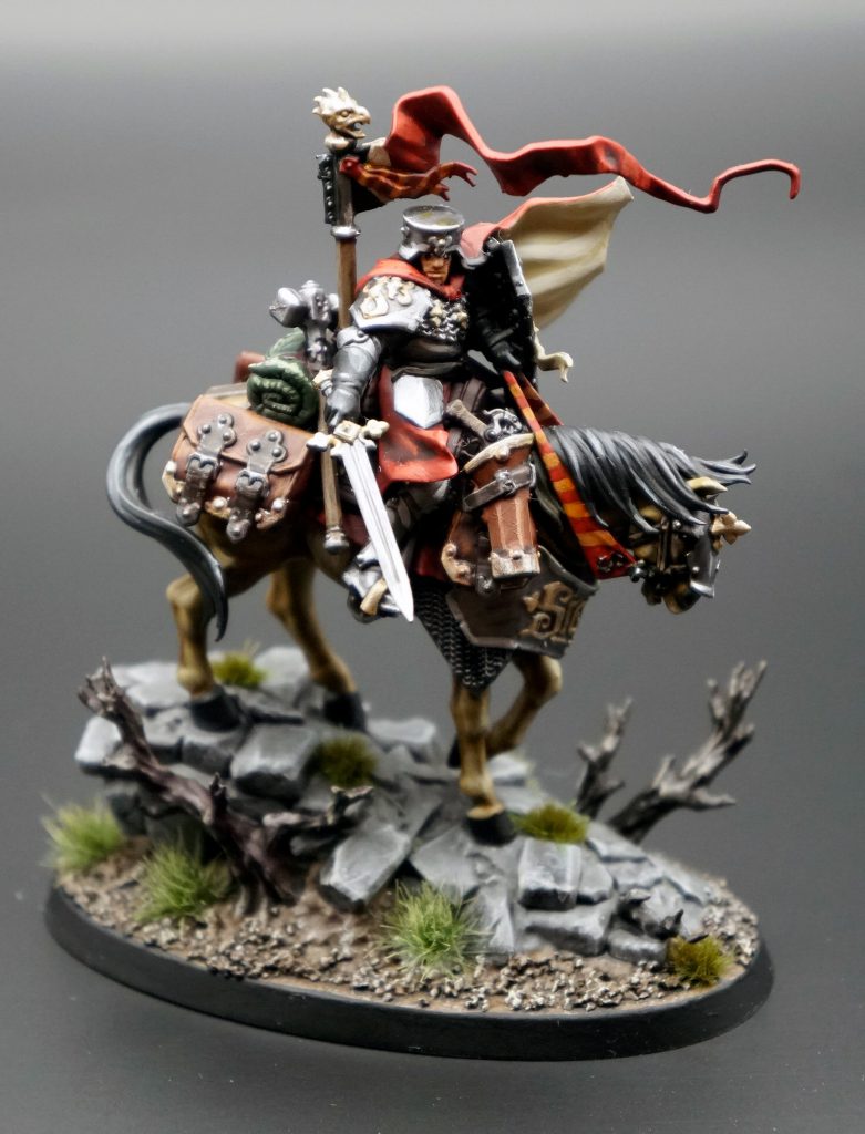 Conner TolbertNow we’re about two weeks out from Cherokee and I have a one-day practice event the coming weekend. The deadline is tight but I’m feeling confident. These are the models that I need to get right and so I need to slow down and really spend the time to make them stand out. I start with Pontifex and hit a snag trying to get the color for the wood just right, but Warhipster is here to save the day and his tutorial really helped here. I spend about twelve hours over two days to finish her up. Next, and the model I had originally planned to paint last, is Tahlia. I just really wanted to paint it, what can I say? I look up how to paint chevrons and tutorials on painting bird wings. I used a video by a small YouTube channel called Nyaras Workshop for painting tips on Infernadine, Tahlia’s manticore mount. An airbrush came in clutch for being able to quickly knock out the two monsters in my army and I highly recommend getting one to anyone who doesn’t already have one. Tahlia takes about twenty hours over three days, the chevrons and freehand on the cloth takes too much time to get just right, but the practice pays off on the final two models. The Cav Marshal is next and having painted fifteen horses and with my practice of the freehand on the banners under my belt I knock him out in about seven hours.