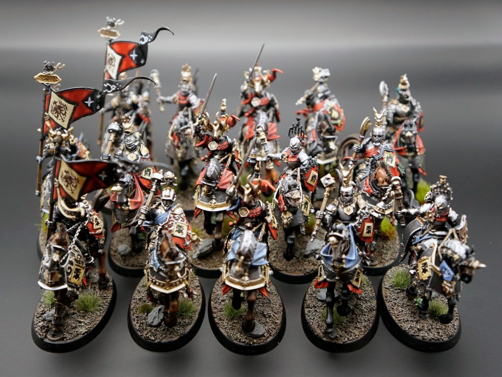 Next, I moved onto my Freeguild Cavaliers, and I’ve got to say: these are a joy to paint. I’ve painted several units of cavalry before, namely the Lumineth Dawnriders and Windchargers and hated every minute of it, so I was dreading these. But once these 15 horses were complete, I would just have hero-style models left; so I loaded up “The Blade Itself” audiobook and hunkered down for what I thought would be the true slog of this army. Only it wasn’t a slog. Somehow GW designed a model that looks complicated and very detailed, without the paint jobs requiring insane hours to show that off. It’s black magic for all I know. I put my basing material down first here and then primed black. I was going for a dingy metal look so stippling with a gunmetal color did ninety percent of the work here. From there I made three slightly different schemes, each to go with my planned mounted heroes. One unit for Tahlia, one for my Cavalier-Marshal, and one for my Marshal on Griffon. These took about thirty hours to complete, with extra care spent on the banners - one of the major focal points of these units.