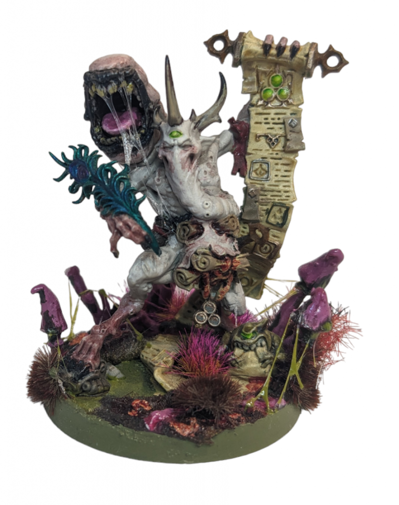 The model itself isn’t all that difficult to put together, but watch out for the scroll. You have to simultaneously connect the scroll at the bottom, and also with the arm. I somehow messed up both with my first attempt, so ended up a model with a floating arm, where the scroll didn’t match up at the bottom. I ended up having to compensate with green stuff, and covering up any other gaps with Nurgle’s Rot. Most of the model is pretty accessible without the need for sub-assemblies, but the scroll may be a little harder to get to once assembled, so that might be worth sticking on after you’ve painted.
