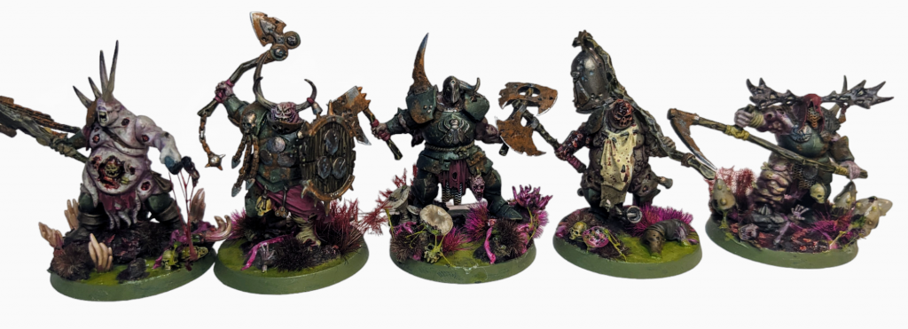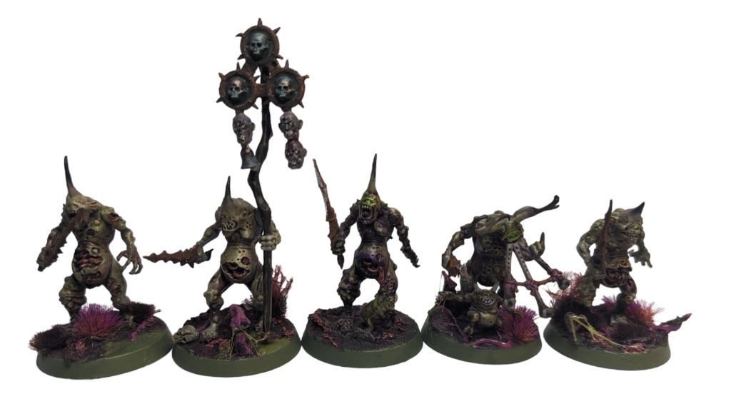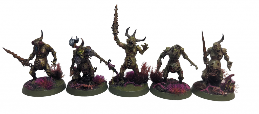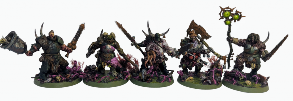Use some sort of rust effect, like Typhus Corrosion and Skrag Brown, on the swords, and pick out the pus-filled buboes and the horns and they’re set to go.