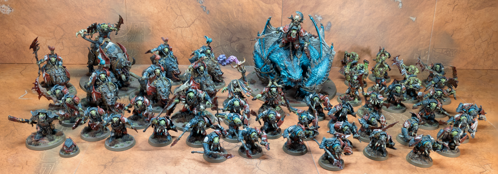 A much more fun list, and one that I don't think could have been attempted in serious play, is three drops and includes a Snatchaboss on Sluderaker Beast (320) with Egomaniack and Mork Eye Pebble, and a unit of gutrippaz. The second regiment is a Mirebrute Troggoth (220) and three units of gutrippaz. Finally, the last regiment includes another Mirebrute Troggoth, a Killaboss with Stab Grot (130) , and two Marshcrawla Sloggoths. Of course, we are taking Trophy Finga, for the "Meanest Beasts" trait that gives Crit (2 Hits) on all of our companion weapons. Is it worth it to give up on casting and shooting to just get into your opponent and smash face? Probably not. Is it fun to play with the new abilities in a new edition? Absolutely.