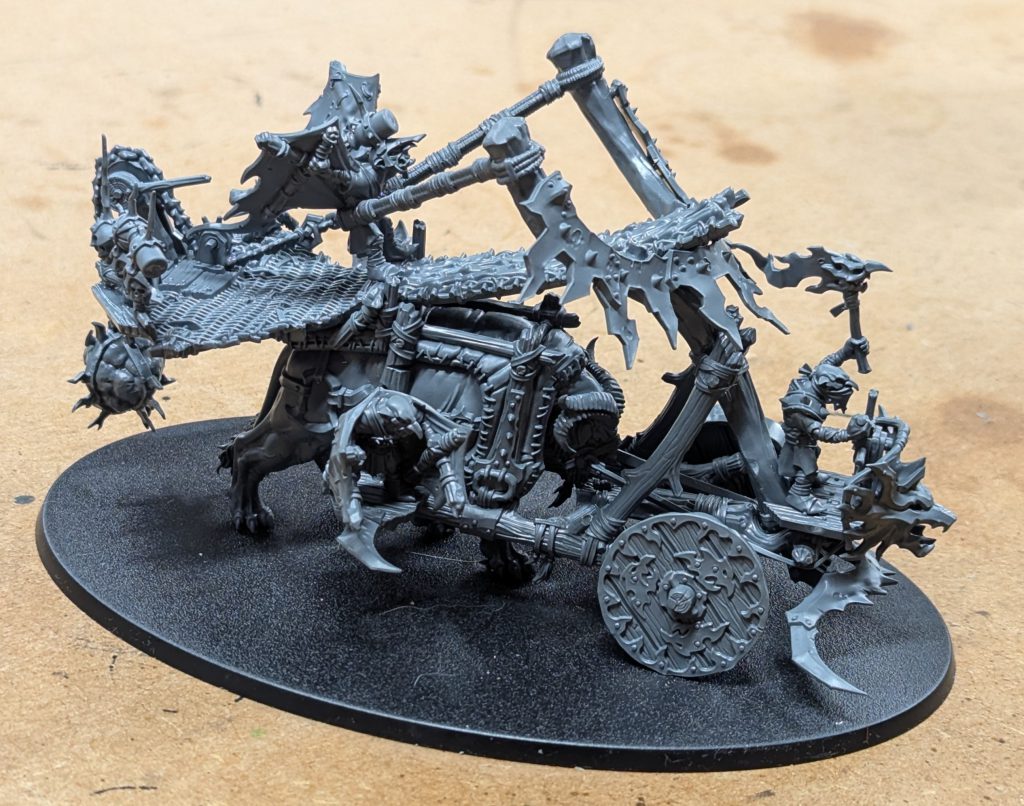 Built Doom Diver Catapult. Credit: Rich NutterThe build experience on these was pretty fun, as with most of the new Gitmob kits. Parts mostly slotted together well, with good contact points and intelligent hiding of mold lines. I did have a couple of trickier moments with the War-wheela chariot: the sides do not initially locate very well until you also slot on another assembly, so I ended up with one of mine at a slight angle. This wouldn’t be too noticeable except that a pole passes up through the side, and a slight tile at the base becomes really obvious further up. I opted to break it apart and re-glue. I also had some difficulty seating the main trunk of the Shaman’s post - it needed some real pressure to sit close enough for all of the chain parts to also meet the floor of the chariot. Luckily it all looks great now it’s together, so no harm done!