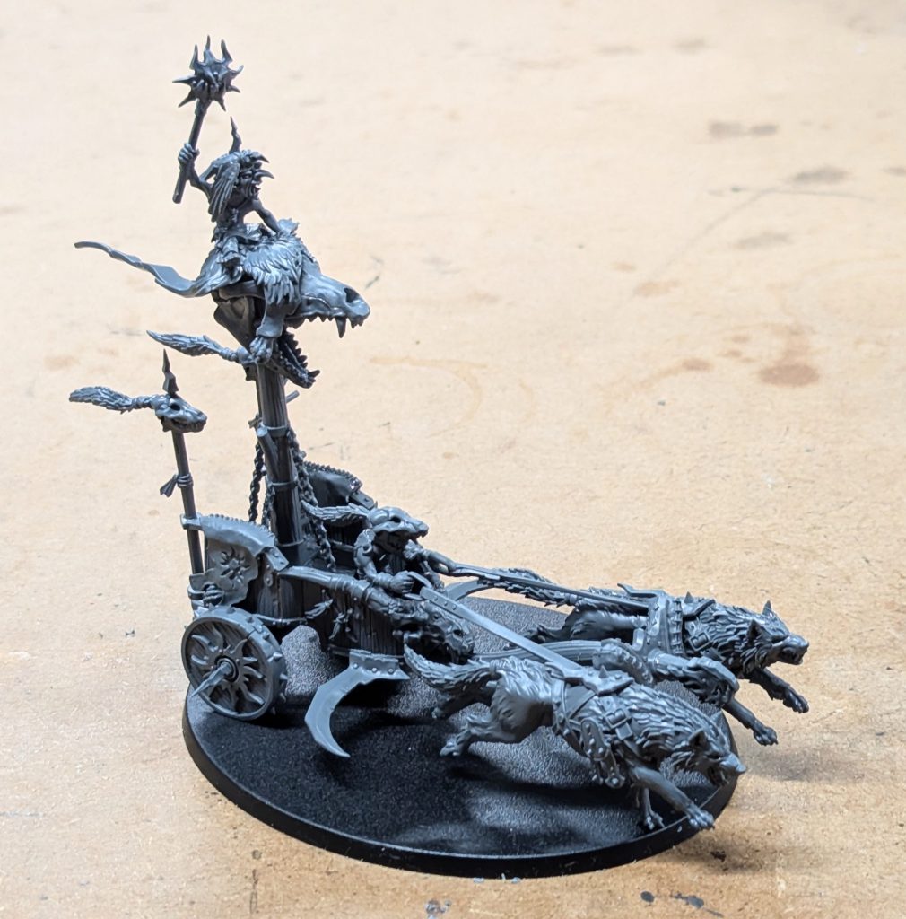 Snarlboss on War-wheela. Credit: Games WorkshopMeanwhile, across the battlefield, chariots thunder towards the enemy lines. Unlike the Sunsteala Wheelas that we’ve already seen, flimsy and disposable contraptions of wicker, the War-wheela is of sturdier wooden construction, and a fair amount larger. The driver gets a bit of protection, rather than just sitting on a cushion, and the Snarlboss (of a similar level of paunch to Droggz) stands tall (relatively) in his section, ready to dish out some beatings with the hefty flail he wields. On the back, a runt prepares to light some explosive bottles of brew for a speed boost at the opportune moment.