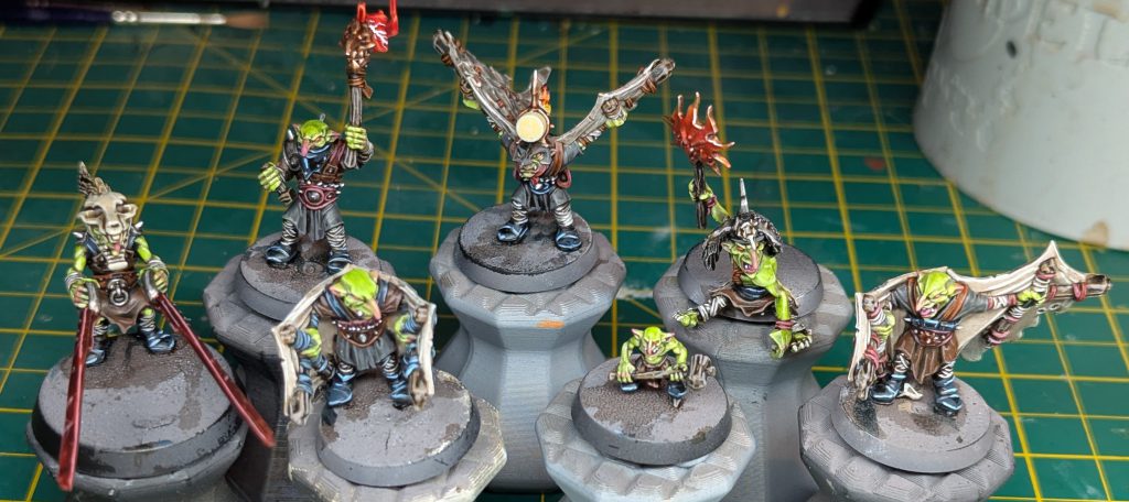 Crew-gits completed. Credit: Rich NutterFor this mini-project of two war machines I chose to paint the collection of grots first, mounted to individual bases for painting. This meant I could really take my time focusing on common elements like the skin, without having to also be thinking about big areas of fur and wood at the same time. I’m pretty happy with how the skin has come out - it’s a base of Gutrippa Flesh, washed with a warm red-black wash, then highlighted first with Pro-Acryl Bright Yellow Green and then the same mixed with Dark Ivory. The pink noses, ears and knuckles were glazed with Dark Hot Pink, feathering back towards the green where necessary, before reapplying some of the final highlight over the join.