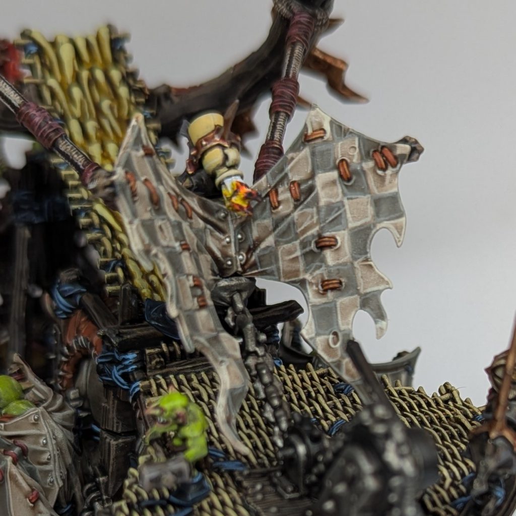 Doom Diver freehand. Credit: Rich NutterAlthough I do a lot of “proper” highlighting on these Gitmob models, for the wooden parts of the warmachines I did resort to a few coats of drybrushing both before and after the wash step, to build up texture (and also ensure that this article was not two weeks late thanks to endless edge highlighting). I think the wood texture takes the drybrush really well, and I have gone back with a few fine brush highlights where required.
