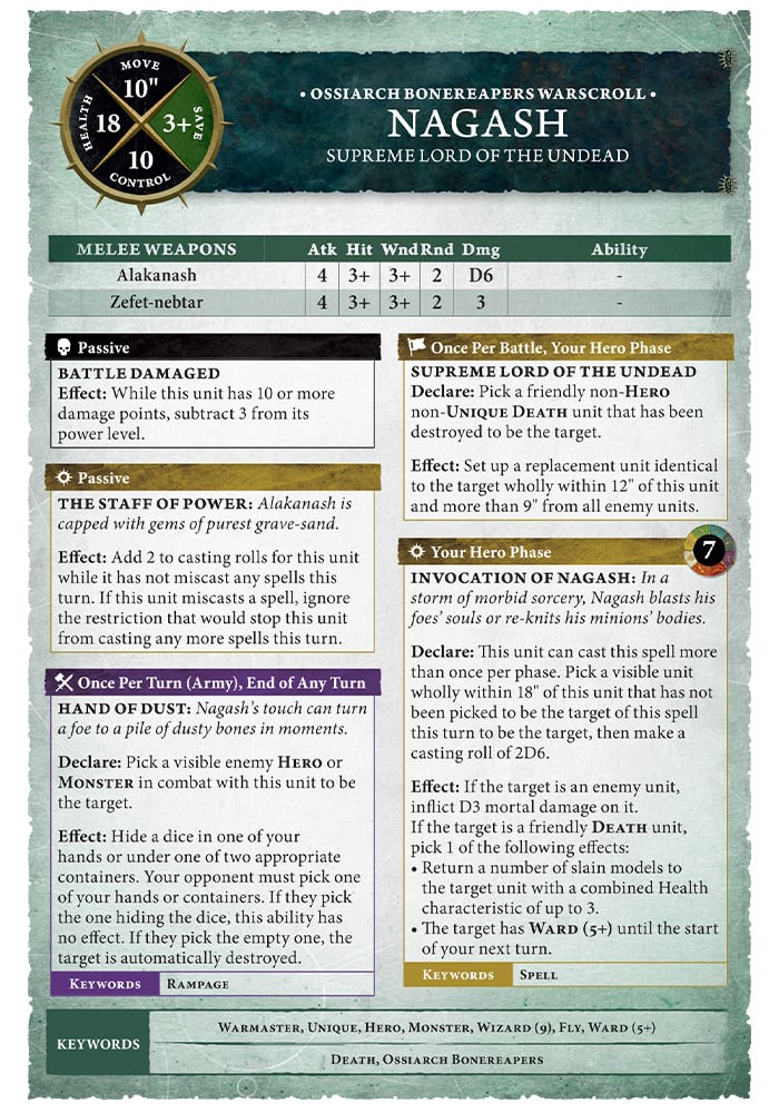 - New Warscroll - There is almost too much in the new warscroll to go over and we will have a more detailed discussion once we have additional information. Above, we see Nagash as he appears in the Ossiarch Bone Reapers army. There has been some justified concern that a simplified warscroll with a set text space might not include all of the complexity we love, but there's still a lot there. An example of the ease of use is that multiple friends of mine pointed out that Nagash is now able to continue casting after a miscast even though this wasn't highlighted in the article. Another change that several people pointed out is that the nine books of Nagash now allows him to cast nine times. From my perspective the warscroll looks familiar enough and learning how to scan for Crit(Mortal) instead of "If the unmodified hit roll for an attack made with a Stormspear is 6, the target suffers 1 mortal wound and the attack sequence ends (do not make a wound or save roll)." Hopefully the rules govern what happens when a damage characteristic is increased, or when a unit improves when crit rolls are made.