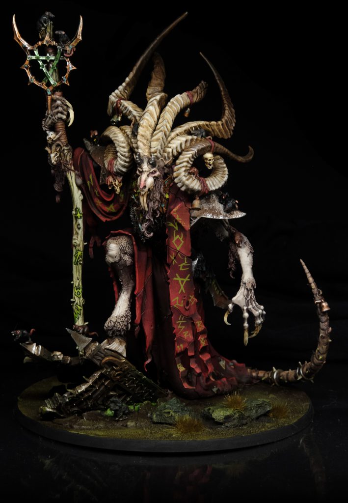The headline act is Vizzik Skour, a new daemon-rat unleashed by the energies released upon the freeing of Kragnos, and a prophet of the Horned Rat. Beyond being an astoundingly good model, Vizzik is a Priest (2) with 15 wounds, a 5+ save and a 5+ ward (making him marginally less tough than a Plague Furnace). Unlike the Verminlords, his melee profile is nothing to write home about so we're all-in on abilities for his utility. You get a once-per-game re-roll on chanting rolls until the start of your next turn which is nice, as Vizzik's warscroll prayer chants on an 8 - it can target enemy units for -1 Attack in melee or a friendly unit to get two Fight abilities, with the second granting Strike-last. Then there's two combat phase abilities - Gaze of the Gnaw picks an enemy unit in combat and on a 2+ forces them to target Vizzik and subtract 1 from hit and wound rolls when they do so. -1 to hit and wound on top of the ward does actually go a fair way to increasing Vizzik's survivability. Finally, Fissures in Reality gives you more of a reason to want to be in combat and tags each enemy unit in combat with d3 mortals on a 2+. Overall, he's decent. The only Priest (2) in faction gives Vizzik a suite of strong buffs and debuffs. The poor save and mediocre damage output make me hesitant, as does strong Priest competition from the Plague Furnace. If he's not too expensive, Vizzik can see play as a supporting toolbox.
