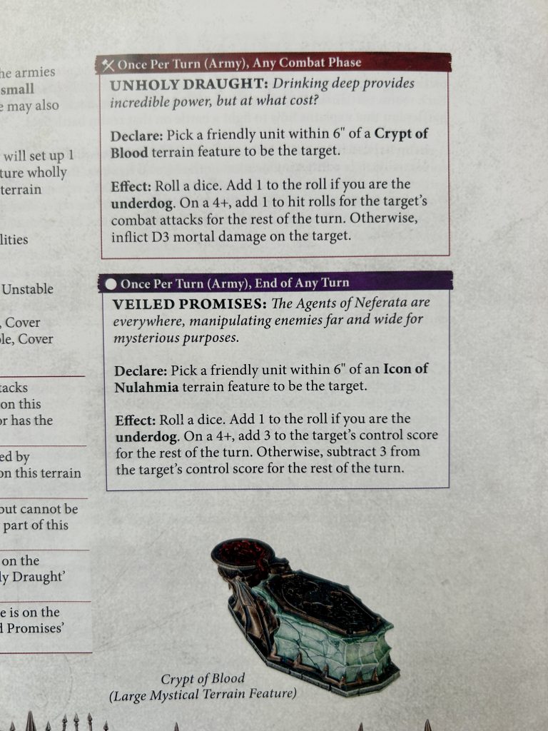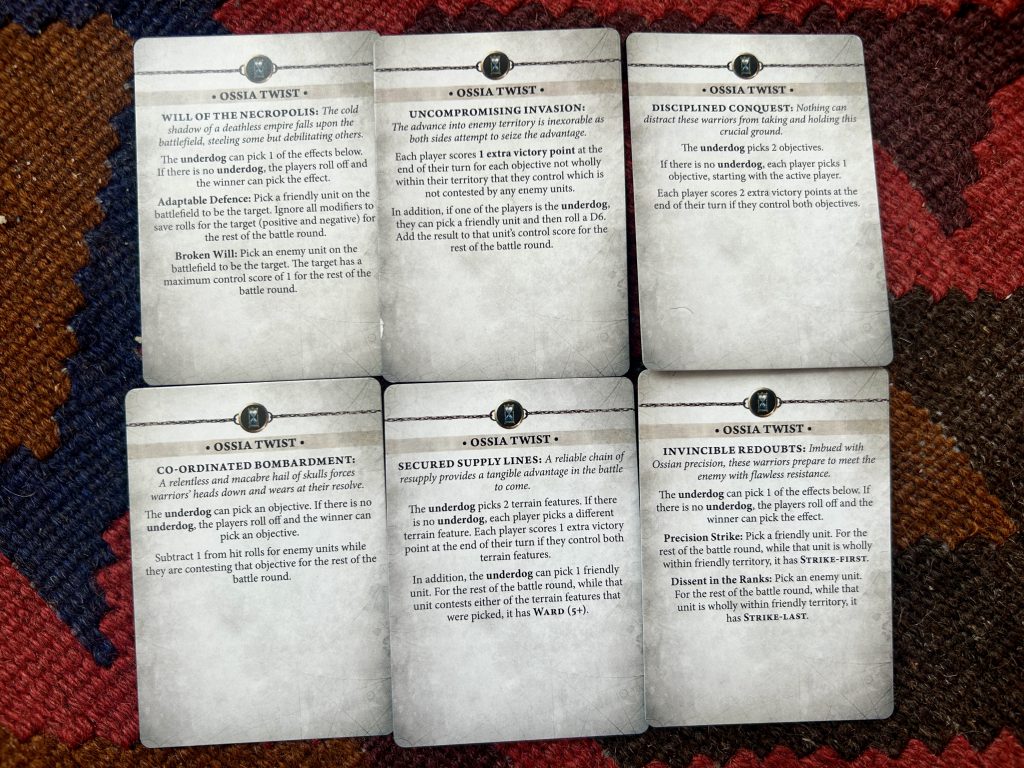 - Ossia- Will of the Necropolis: Underdog picks (or roll off), winner gets to pick either a unit gets an un-rendable save for the battle round OR an enemy unit has max control 1 for the round. Powerful sauce!?