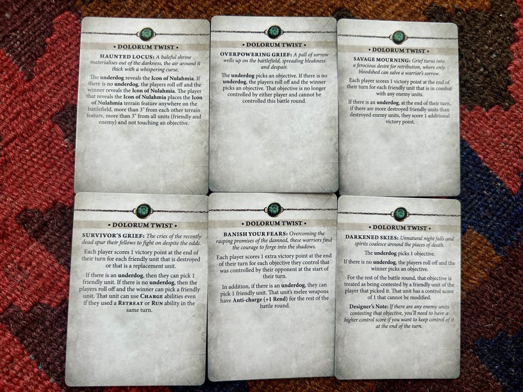 - Dolorum- Survivor’s Grief: Each player scores 1 VP for each unit that has been destroyed or that is a replacement unit at the end of their turn. Also the underdog (or roll off) gets to pick a unit to Retreat/Run and Charge. Chance for a big swing back if you’re losing here. Which is fun!