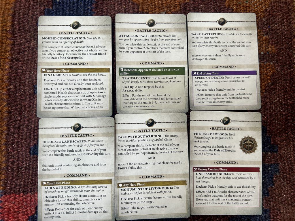 TwistsThe Battle Tactics cards in Spearhead have two options, the tactic and a command you can use instead. So if you can’t score the points, you use the tactic, or maybe you sacrifice an objective when you REALLY need to reroll that charge. It’s a fun mechanic that promotes tactic decision making and hints suggestively at the advanced rules of the game. These new cards have mainly repeated Tactics, but the Commands are almost all new, other than a couple of repeats (Dig Two Graves and The Grip of Death). Some of these are WILD and I’m enjoying them! Some faves: