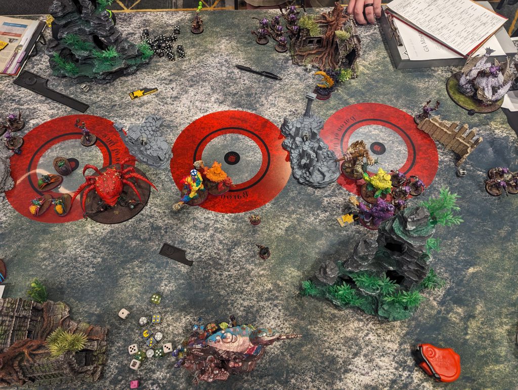 I gave him the first turn (to avoid a double) and disrupted commands in the hero phase to prevent him from cheaply moving up his brutes. I knew this put a wrench in his plans because the wording interaction would have required up to 4 additional command points to move 4 inches. He was able to get his tactic and had a large part of his force on the right and center point. My turn saw me fail a few spell casts and take the left point and put just enough hoppers on the central point to take it back. I won priority and gave away the turn as I wasn't fighting anything good and he charged into my hoppers and gobbapalooza. I had positioned a webspinner shaman to sit and prevent a charge from the mawcrusher to kill the moon but didn't have any significant offense as I lost my hoppers, my gobbapalooza, and a few spiders to a truly epic smashing and bashing sequence.