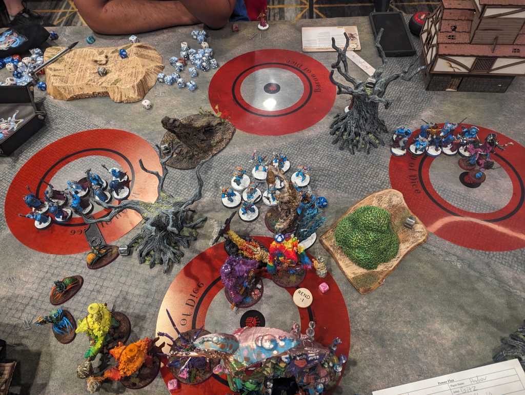 I'm not sure how I would have done against the trogg list but splitting the moon is pain. I'm not sure my comment of "fuck it" was particularly helpful to our captain in pairings.This game had the best vibes and was the most interesting to think about when recapping the event. An outsider to our hobby looked at a picture and asked if I a gay orgy occured after it was taken. Honestly, you can judge the look but having never been invited to a gay orgy I don't know how they start. This was, however, a prelude to epic battles in the mortal realms where honor was won and lost.