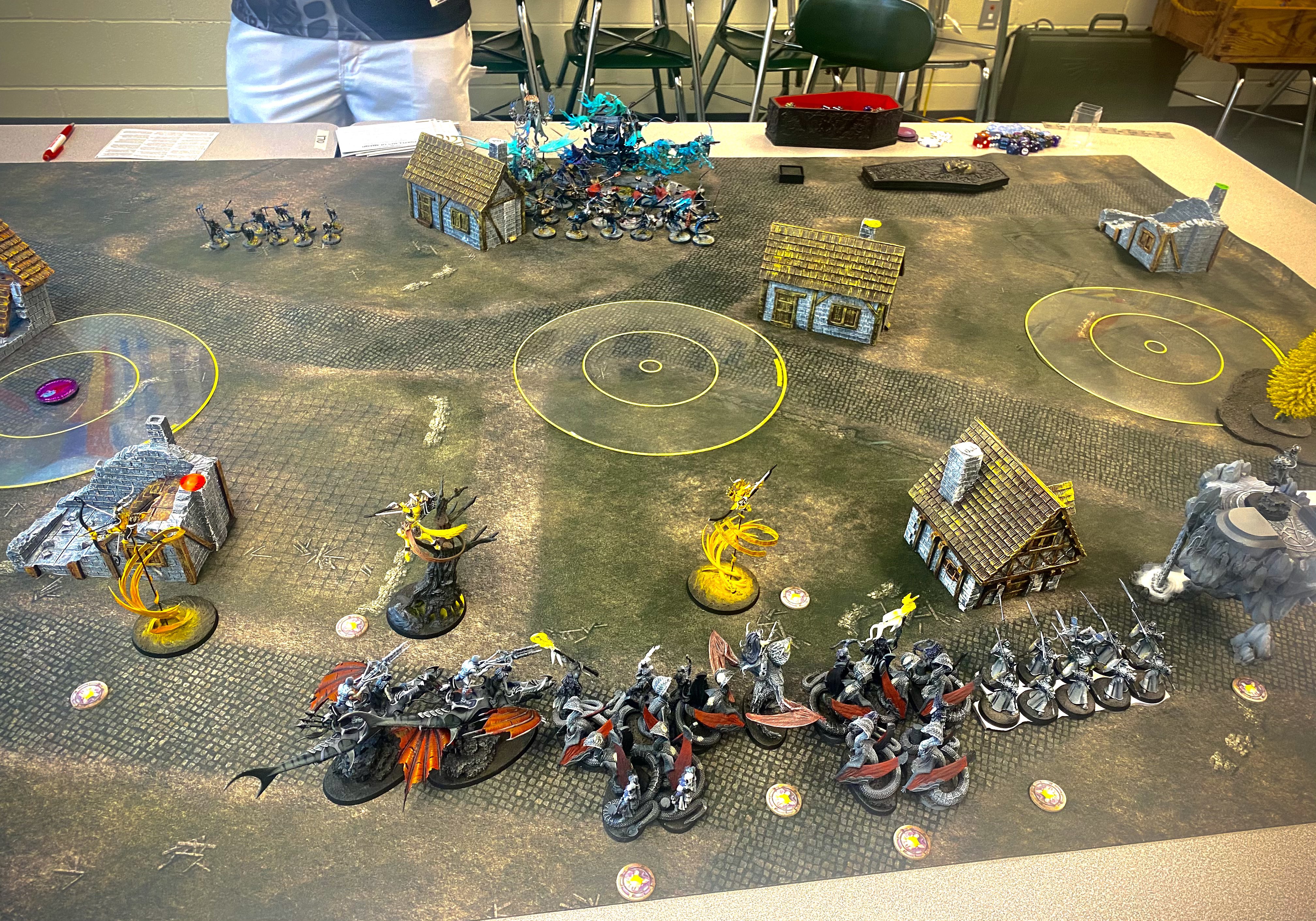 If you think that an army with 3 walking heroes taking on one with 3 wind spirits, a few units of shooting, a loreseeker, and 2 sharks on a mission in which only heroes can score would be in for a rough game well, you'd be right. It was a tough game. But my opponent was also a trooper about it. He took the first turn and grabbed the center as well as the objective on my side of the table. Meanwhile the loreseeker was sitting on the one closest to my side just mad chillin'. He takes the lead 2-0.