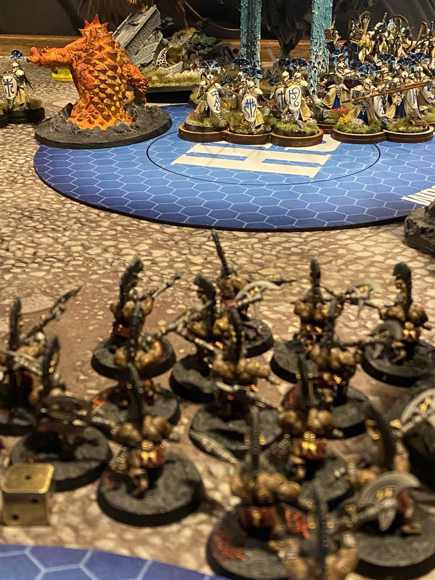 The Runemaster summoned in an Infernoth, at double range thanks to his artefact, causing a few wounds to the unit of Wardens but trying to do enough chip damage to the Cathaller to remove it after a few passes, which was stopped due to solid Heroic Recovery rolls. Overall the Infernoth didn't do anything to write home about this game.