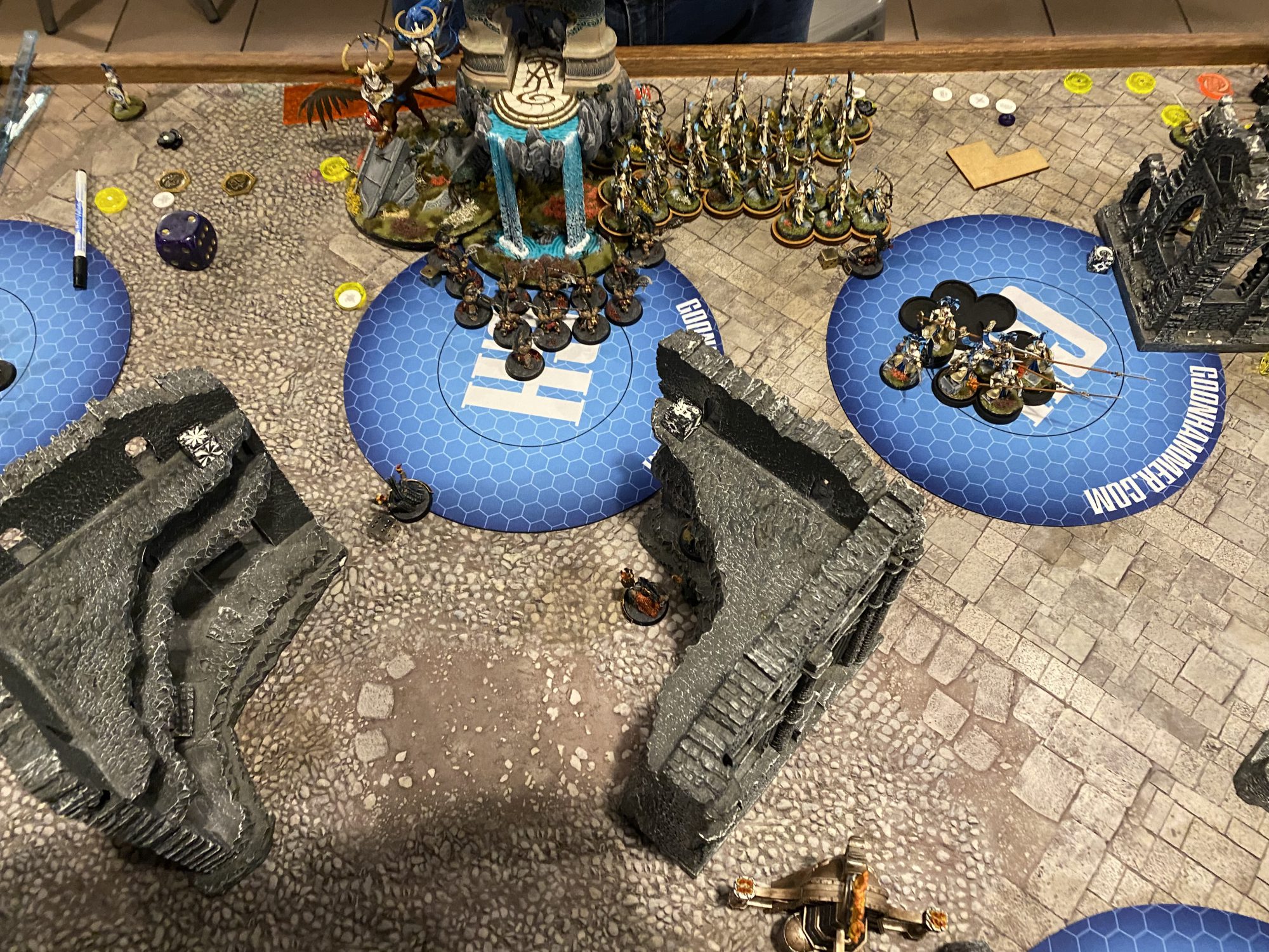 We set up all of the objectives for ease to be used from turn 2 onwards, with the final becoming the only active one from turn 4. Also, ignore that one lone Hearthguard in front of the rest of his unit, I took the pic before fixing it and didn't take one after, sue me.